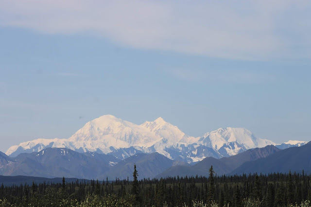We left Denali National Park this morning and drove 90 miles south to K'esugi Ken Campground in the Denali State Park. To our amazement, we were able to see the highest peak in North America, Mount Denali. It rose 20,310 feet above sea level and extended into the blue sky. It is rare to be able to see the whole mountain, since it has its own weather pattern and normally has its peak in the clouds. These pictures are of the mountain from various points along the highway.